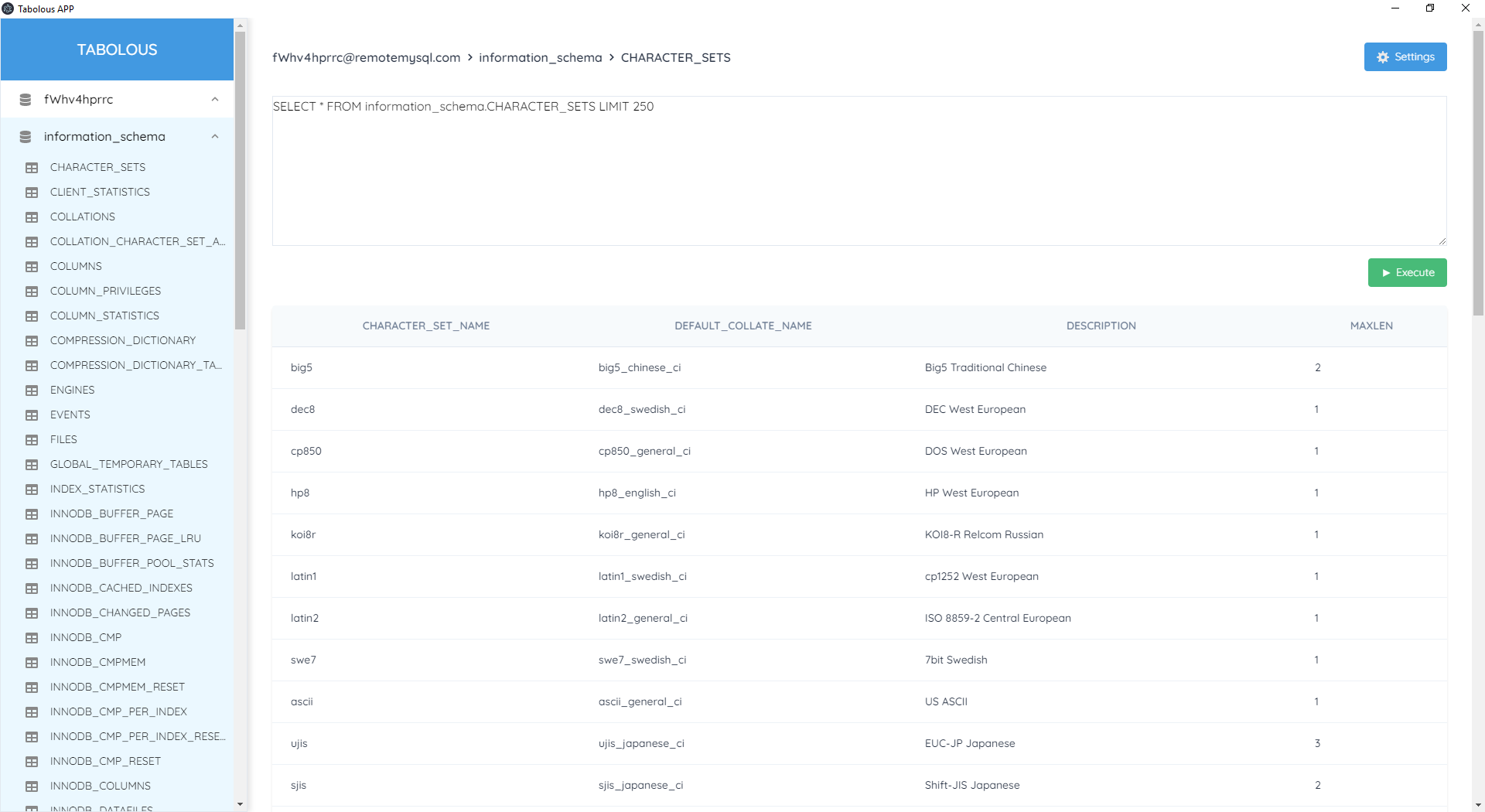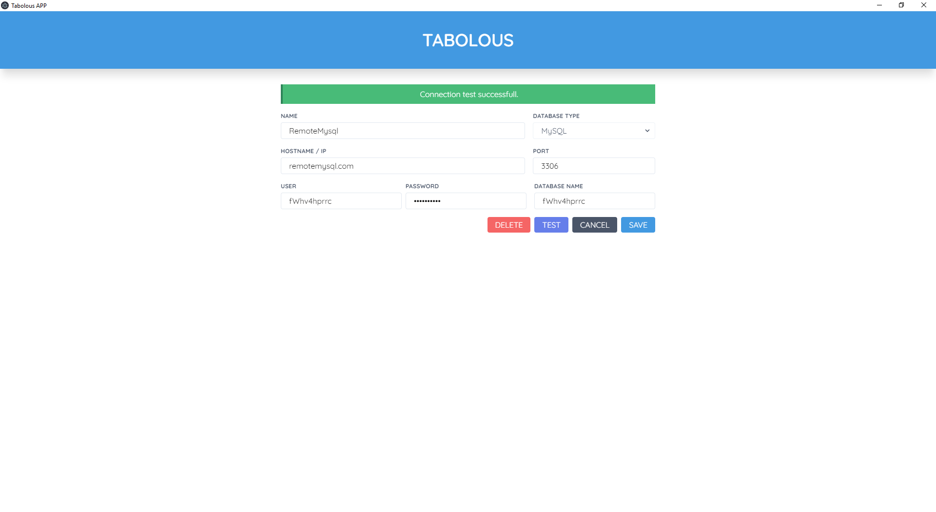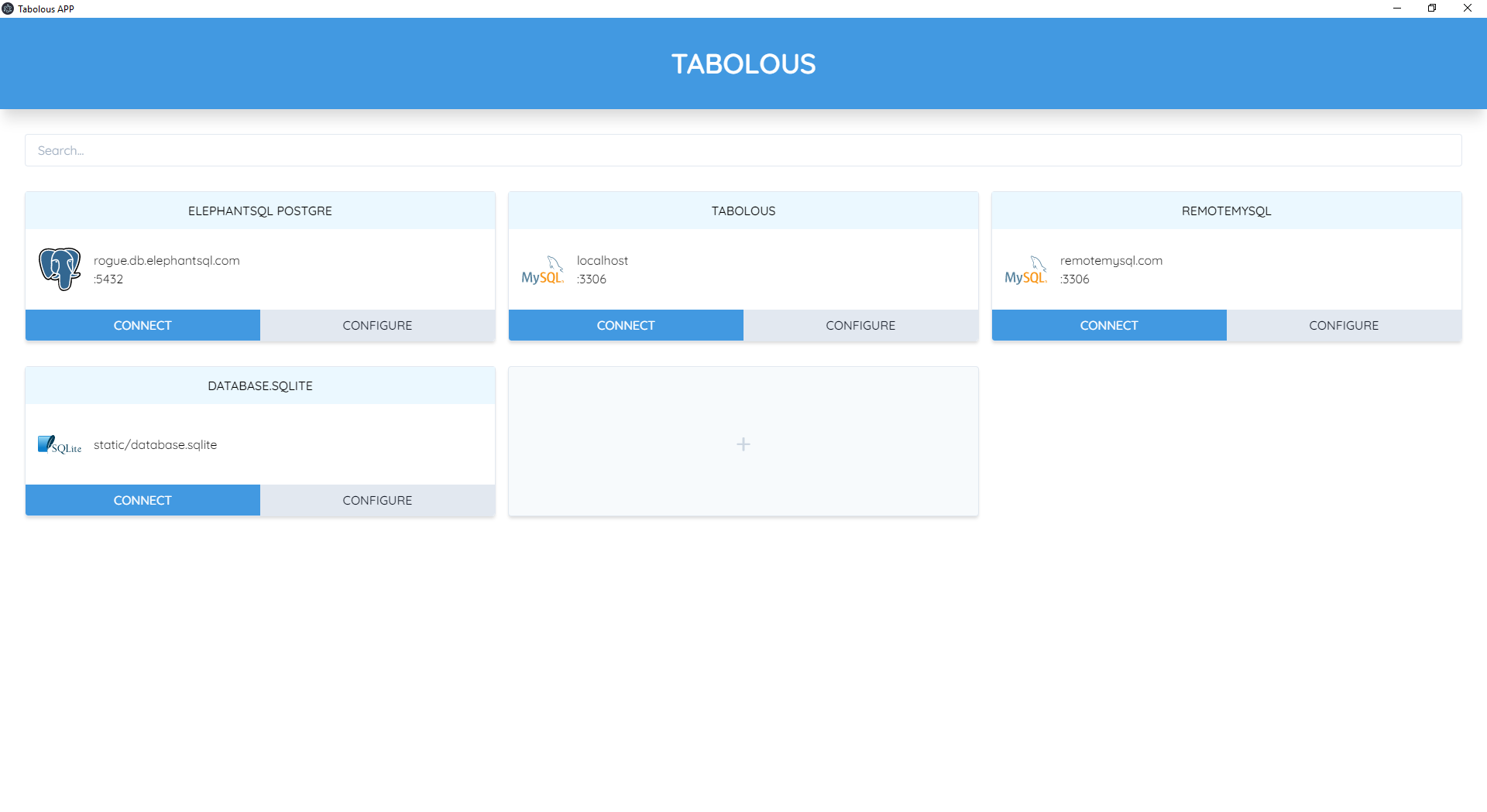 Tabolous est un prototype d'application desktop cross platform qui permet de visualiser et d'interagir avec des bases de données. Encore au stade embryonnaire mais fonctionnelle, seule les bases de données MySQL sont compatibles pour le moment. Plusieurs fonctionnalités sont prévues telle que la compatibilitée avec SQLite, PostgreSQL et MSSQL